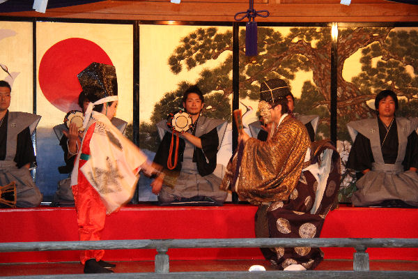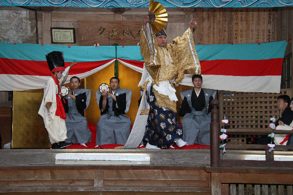 - 大きな銀杏親子イチョウで知られる伊那下神社では、おごそかな雰囲気の中、三省社(松崎)による三番叟が披露されました。