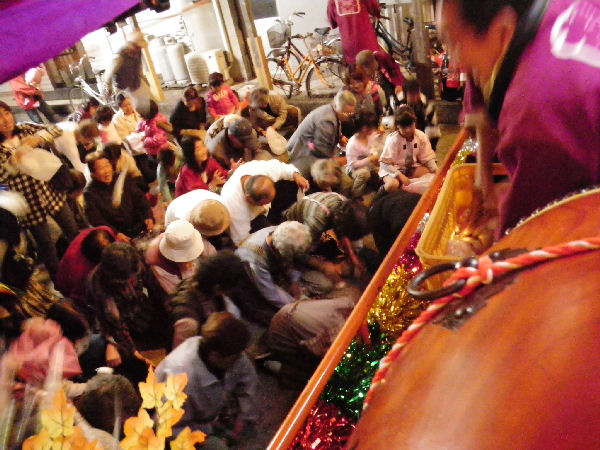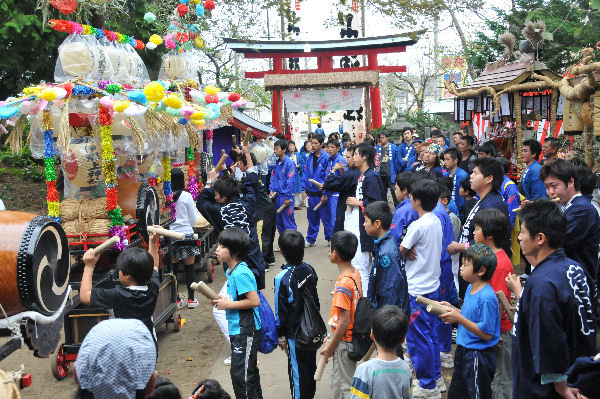 - 今日は朝から祭りの太鼓や笛の音が町内に響いています。 各所を練り歩き、所々で餅まきなどで見学者を楽しませます。 写真は桜青会(桜田)の屋台の様子です。