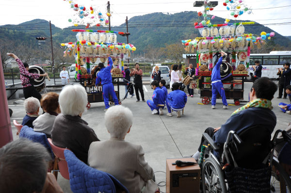 - 宮内区の共盟社では、地区内にあるデイサービスセンターを訪問し、お年寄りの方へ太鼓の演奏を披露しました。