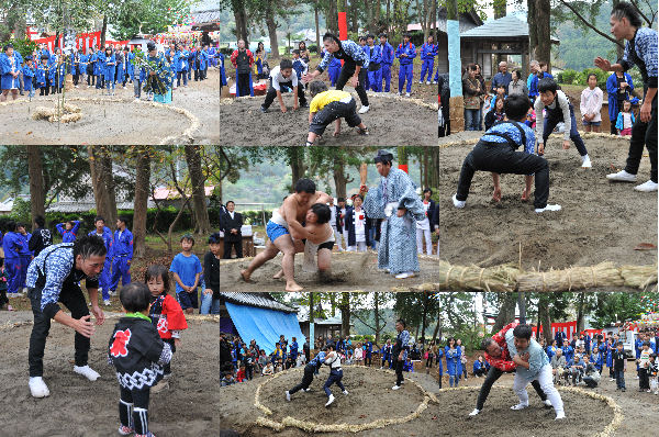 - 伊那上神社では早朝の神事の後、境内の土俵で奉納相撲がとられました。 地元、共盟社(宮内)・伏青会(伏倉)の代表社による取組の後、子どもたちが次々に土俵に上がり取組が行われました。