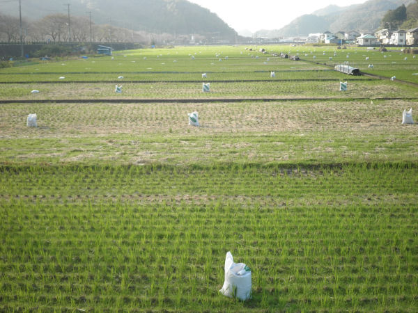 - 今日の那賀花畑です。 早まきの田んぼは、生育がよく一面緑の様相となっています。 霜が降りる前に、早く大きくなることを望みます。