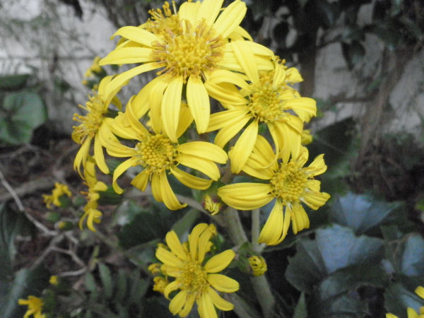 - 松崎町の花「ツワブキ」が盛りを迎え、あちこちに黄色い花を見せています。 蜜を吸いに、セセリチョウや花蜂が飛んでくる様子も見られます。