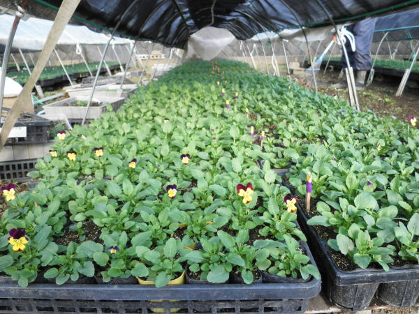 - 町内の育苗場では、ビオラの苗が順調に成長しています。今日は、開花している苗を見つけました。