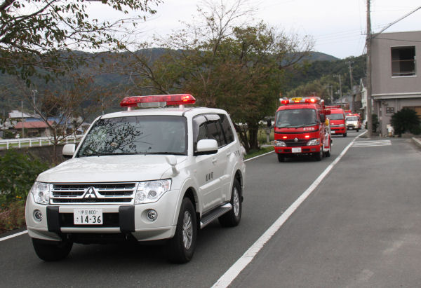 - 今日から15日まで、秋の火災予防運動が行われます。初日の今日は、松崎町、西伊豆町、広域消防本部が合同で広報パレードを行いました。