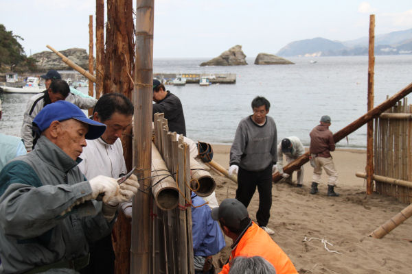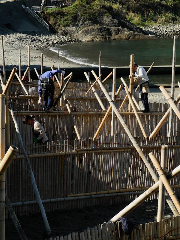 - 雲見海岸では、冬の季節に吹く西風に備え、砂の飛散防止のため区民約140人が出て浜囲いの設置作業が行われました。