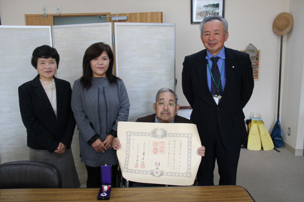 - 先日、地方自治功労による旭日単光章(高齢者叙勲)を受章された細田利平氏が町長に面会へ訪れ、受章の報告をしました。
