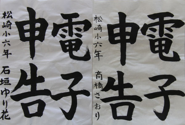 - 伊豆下田納税貯蓄組合連合会では、税に関する作品を募集し、松崎小学校6年生が習字の部に応募をしました。このたび審査が行われ、松崎町長賞に大石浩之進さん、松崎町教育長賞に髙橋さおりさん、伊豆下田税務連絡協議会長賞に石垣ゆり花さんの作品が選ばれました。