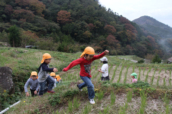 - 町内の幼稚園が合同で交流会を行いました。4園の年長児たちは石部の棚田を探検しました。
