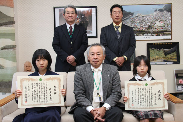 - 松崎町功労者表彰式に合わせ、8月にタイ・パタヤで開催された船越義珍杯第12回少年世界空手道選手権大会で姉妹そろって3位に入賞した指川区の佐藤姉妹へ教育・文化の振興に貢献したことに対する感謝状の贈呈が行われました。