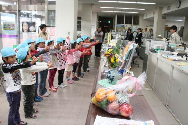 - 明日の勤労感謝の日を前に聖和保育園の園児が役場を訪れ、日ごろのお礼に園児たちが作ったドングリのレリーフなどを町長に手渡しました。その後、園児たちは、練習した踊りと歌を職員に披露してくれました。