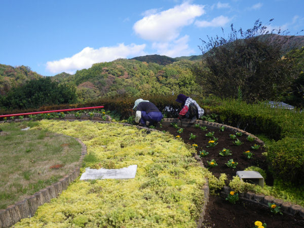 - 道の駅花の三聖苑では、花の会の皆様によって、花時計やフラワーポット、花壇の花の植替え作業が行われました。