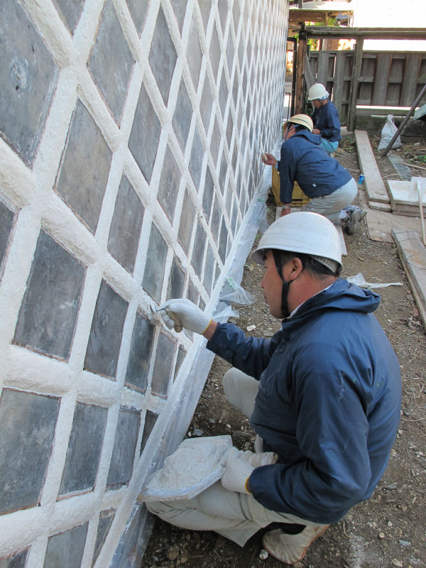 - 伊豆文邸では、なまこ壁の技術を伝承するため、西豆左官組合の皆様に壁の補修作業をしていただいています。なまこ壁の制作過程を見られる貴重な機会ですので、ぜひお立ち寄りください。