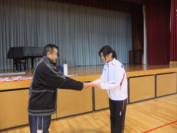 - 市町村駅伝大会を一週間後に控え、松崎町チームでは選手発表が行われました。その後、監督から一人一人に激励の言葉とユニホームの授与が行われました。