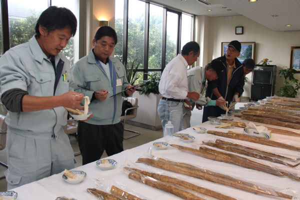 - 環境センターロビーでは、第1回自然薯品評会が行われました。審査会には、賀茂農林事務所と伊豆太陽農協の職員を派遣していただきました。22人の農家から出展された27点について、形状や粘度、糖度など外観と内容についての審査が行われました。