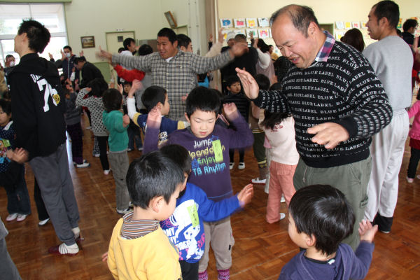 - 松崎幼稚園では、聖和保育園と合同で、ワークショップマナとの交流会を行いました。一緒に踊りをしたり、豆まきにちなんでお菓子まきをしたりして交流しました。