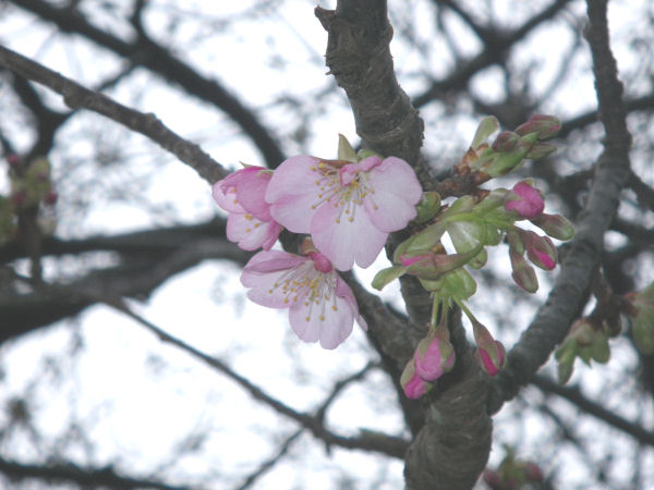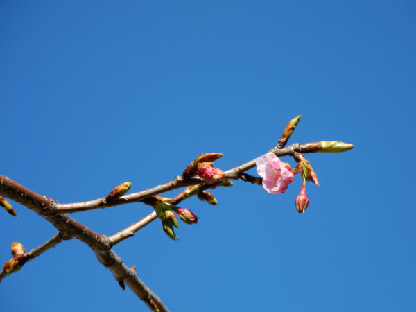 - しんしま橋の袂にある早咲きの桜がほころび始めていました。