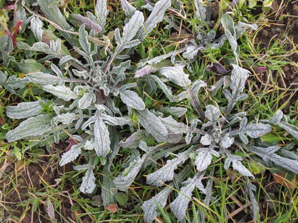 - 今日は風の無い静かな朝を迎えました。町内の空き地や畑などでは、植物に霜が降りていました。