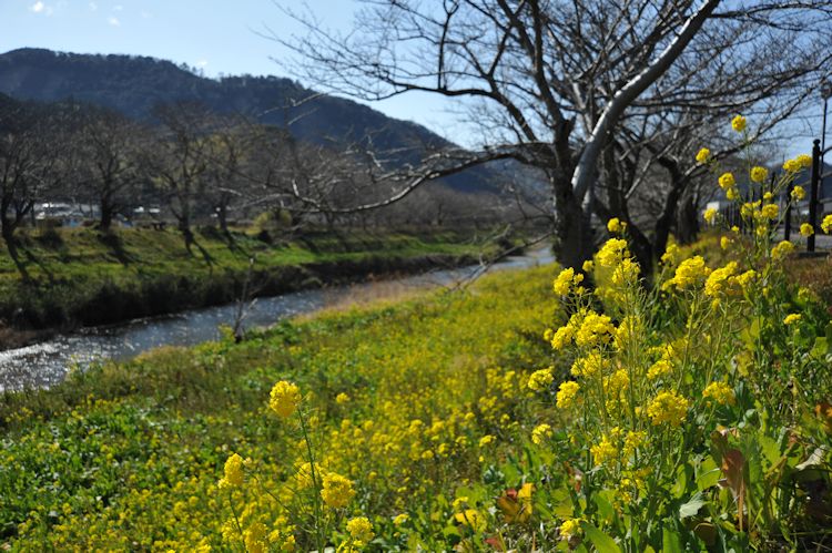 - 那賀川沿いを散策してみると土手の川側斜面に、きれいに菜の花が咲いています。