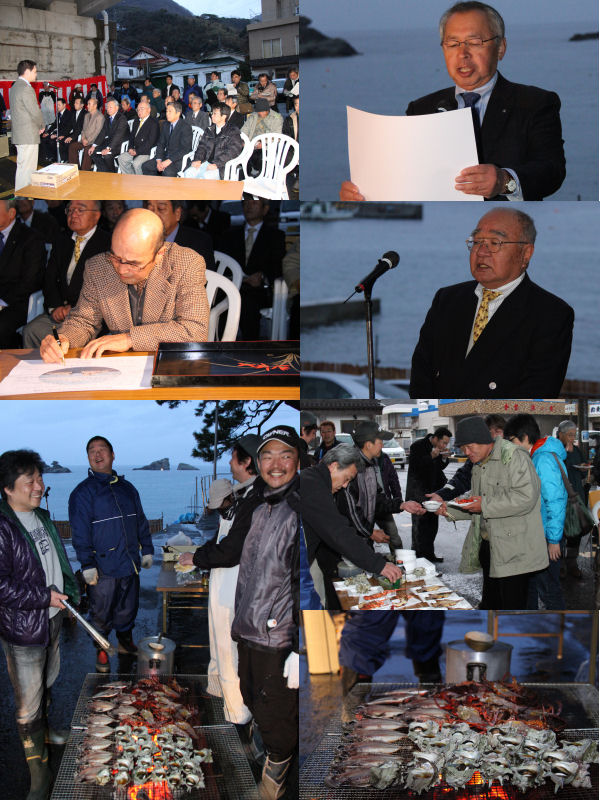 - 富士山の日に合わせ、雲見海岸では、関係者約50人が出席し、齋藤町長が「世界でいちばん富士山がきれいに見える町」を宣言しました。宣言後には、雲見地区の有志の方たちが準備していただいた伊勢えびの鬼殻焼きやサザエの壺焼き、干物などの海産物が振る舞われました。