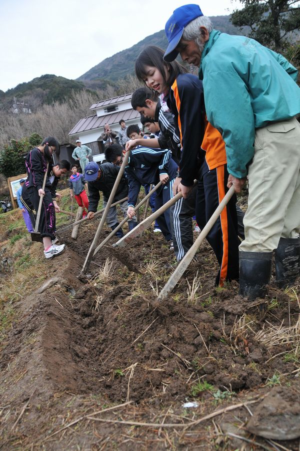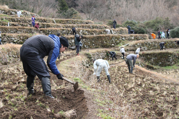 - 石部の棚田では、富士常葉大学の学生37人がアゼ切り作業の手伝いに来てくれました。この作業は、3月2日まで行われます。