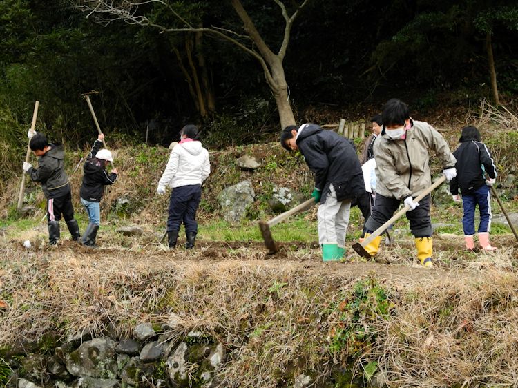 - 棚田百笑くらぶの2月の作業「畦切り」が行われ、子ども、父兄など22名が14枚の田んぼの畦を切りました。
