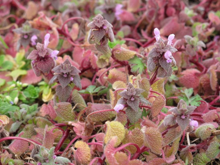 - 用水路のほとりに、ヒメオドリコソウの群生を見つけました。 細かな毛をつけた葉と、紫色の花が陽の光に輝いています。