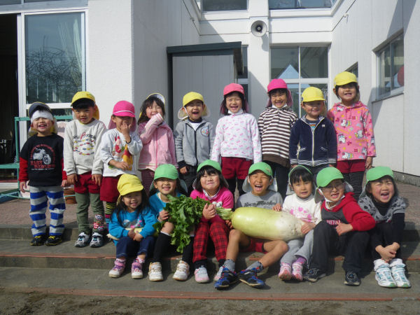 - 岩科幼稚園に近所の農家の方から、大きな大根が贈られました。この大根は、重さ12.5キロ、長さが56センチ、胴回りが70センチもあります。