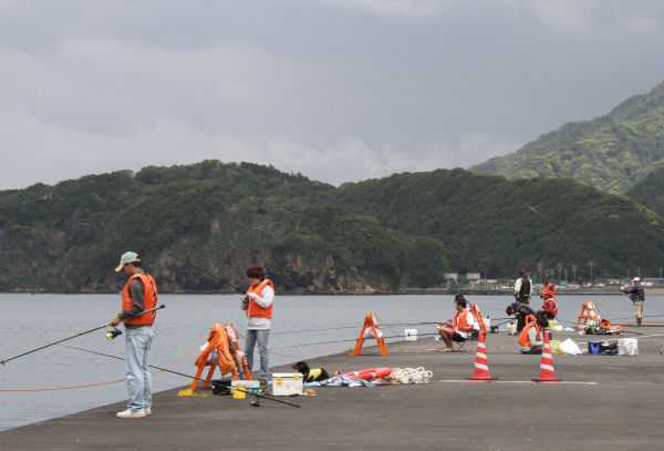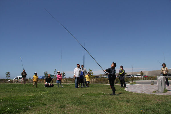 - 松崎新港では、釣り大会に合わせ、子どもや女性等初心者向けの釣り教室が行われました。参加者は、釣りの講義を受けた後、芝生の広場で実践しました。明日も、釣り教室が行われる予定です。