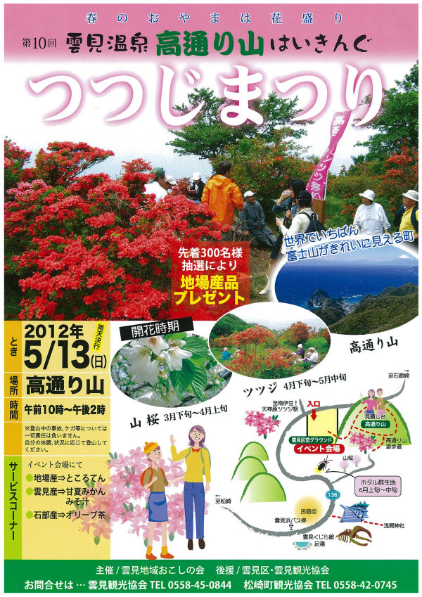 - 5月13日に雲見地区にある高通り山で開催されるつつじまつりのポスターとチラシです。当日はところてん等の無料サービスも行われます。
