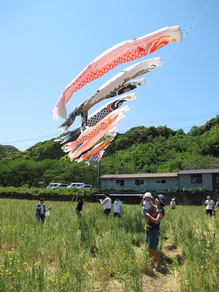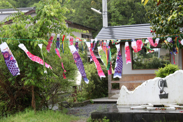 - 伊豆文邸横のポケットパークに、可愛らしいこいのぼりが設置されています。あいにくの天候で、元気に泳ぐ様子をご紹介できなかったのが残念です。