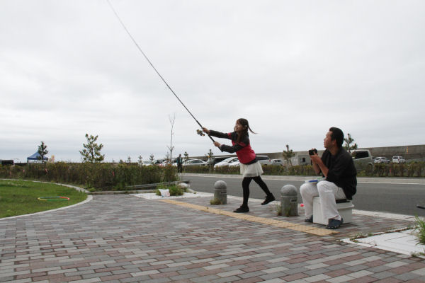 - 松崎新港では、釣り大会に合わせ、ルアーの遠投大会が芝生の広場で行われました。参加者は、大きく竿をしならせ、力強く投げていました。
