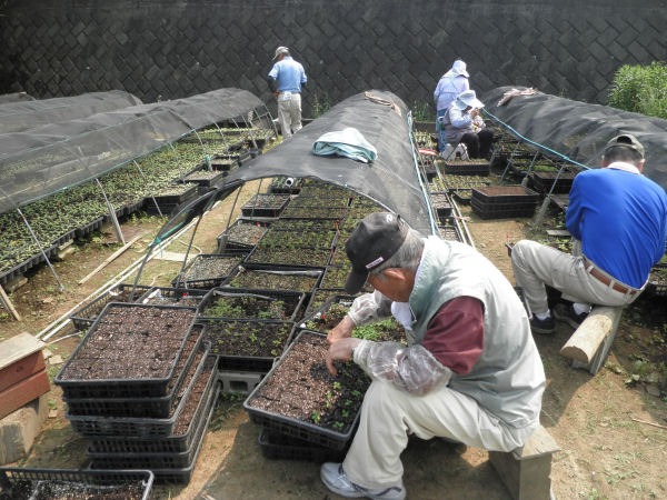 - 老人会の皆様に管理をお願いしている宮内の苗畑では、サルビアの苗の移植作業が行われました。