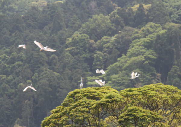 - 那賀川沿いの木の上では、シラサギが羽を休めていました。