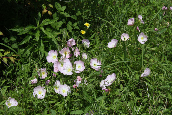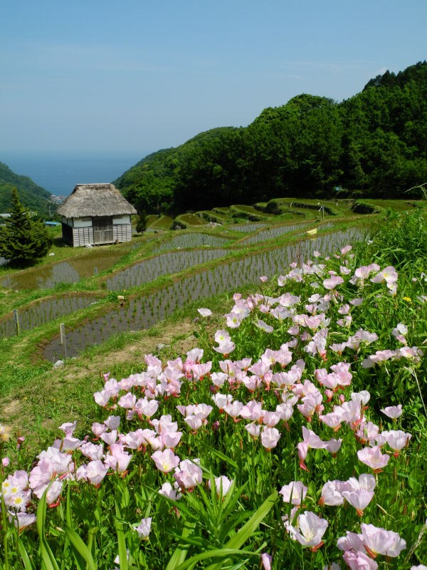 - 石部の棚田には、ツキミソウが咲いています。淡いピンク色が棚田に優しい色合いを添えています。