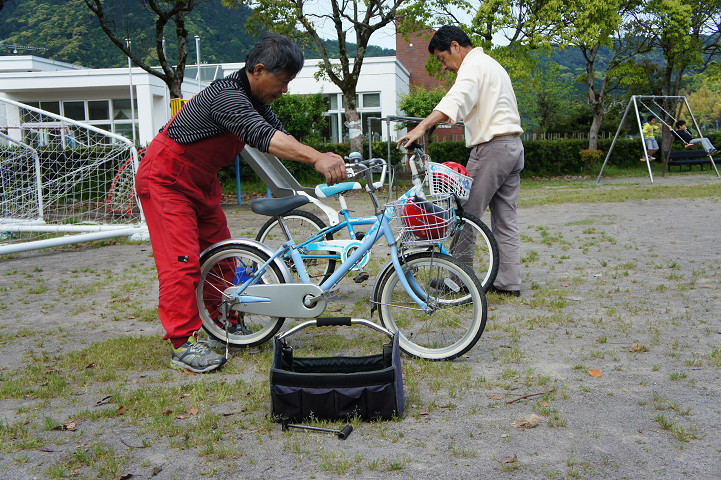 - 本日、中川地区、岩科地区、三浦地区を対象に小学生の自転車点検が行われました。 町内自転車販売店の協力の下、ブレーキやライト、タイヤなどに不具合がないかを点検しました。