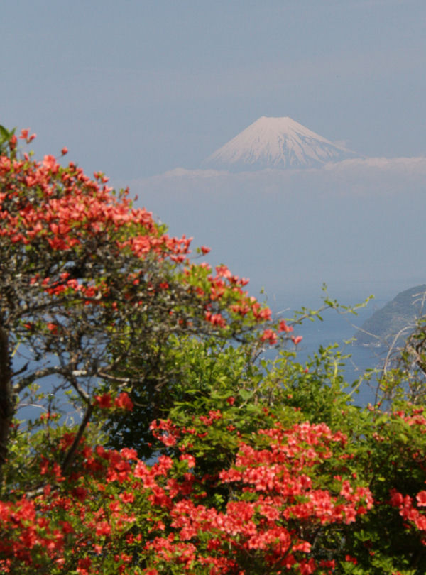 - 13日につつじまつりが行われる、雲見高通り山のツツジは、開花の早いもので満開、全体的にも4〜5分咲きとなっています。