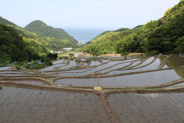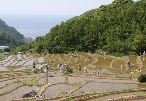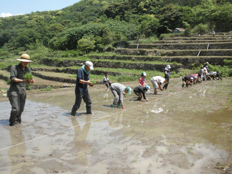 - 石部の棚田で田植え祭が行われました。今年は野菜や柑橘類、ヒジキなど石部の地場産品を販売するコーナーもあり、賑わいをみせていました。