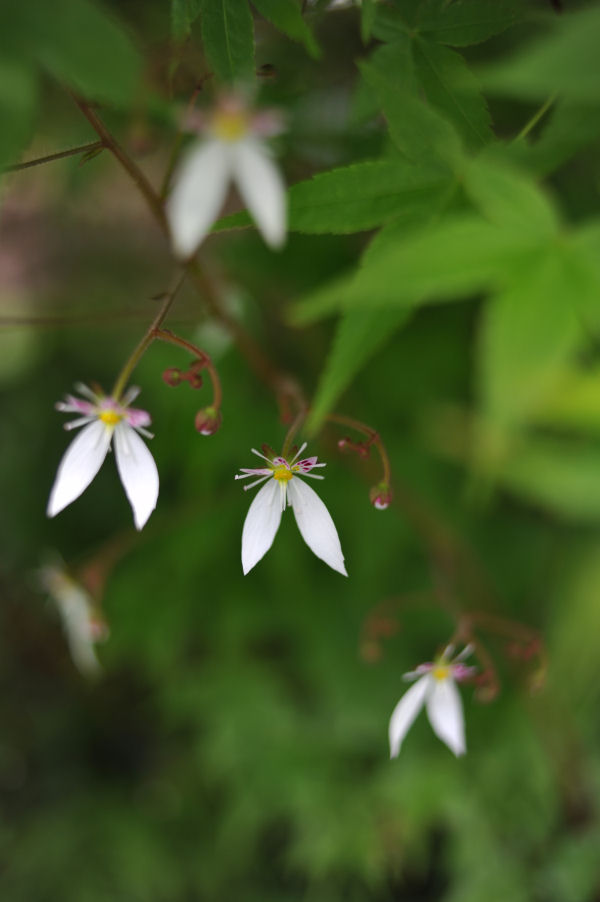 - 湿った陰地の岩場などに、ユキノシタがきれいに白い花を咲かせています。