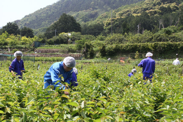 - 松崎町が日本一の生産量を誇る桜葉の収穫作業が始まりました。この収穫作業は8月まで行われ、生葉のまま出荷したり、約半年ほど塩漬けにしてから出荷したりします。
