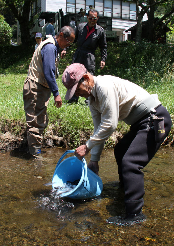 - 6月1日のアユ釣り解禁を前に、那賀川漁協は、稚アユの放流を行いました。放流された稚アユは、川の中を元気よく泳いでいました。