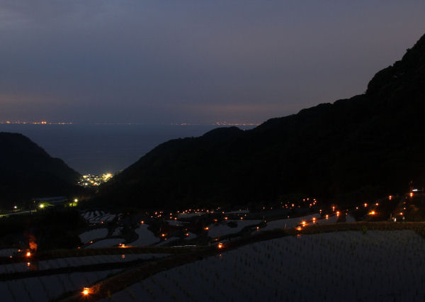 - 石部の棚田で行われた「石部の灯り」の様子です。ろうそくが棚田の畦に灯され、優しい光に包まれました。「石部の灯り」は明日も午後6時点灯開始の予定です。