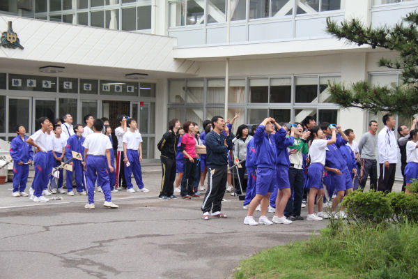 - 松崎中学校では、2枚のレンズを通し、3枚目の台紙に金環日食を映し出す装置を作り、観察に備えていました。雲の切れ間やうす曇りの部分から金環日食が見える度に、生徒たちから歓声があがりました。