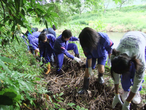 - 昨日の話題です。 ゲンジボタル保護ボランティア(中高生24名)が、南郷鮎川地区で用水路整備を行いました。 整備中のビオトープへ水が流れるように、用水路にたまった木や砂を取り除く作業に熱心に取り組みました。