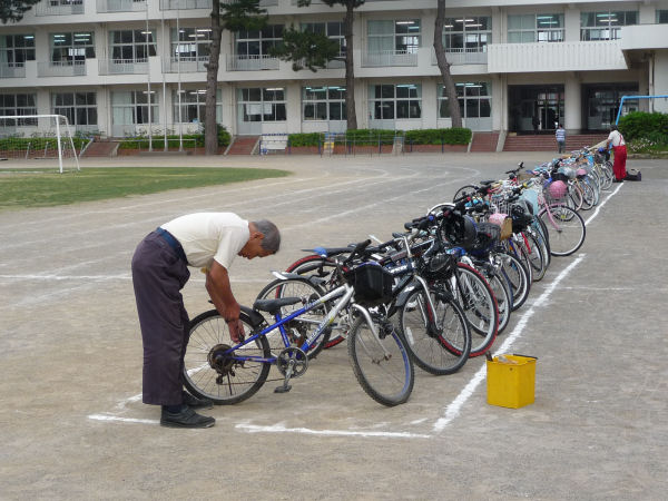 - 松崎小学校の高学年を対象とした自転車点検が行われました。町内自転車販売店の協力により、自転車の不具合などを点検しました。 また、午前中の授業では、交通安全指導員による自転車教室が行われました。