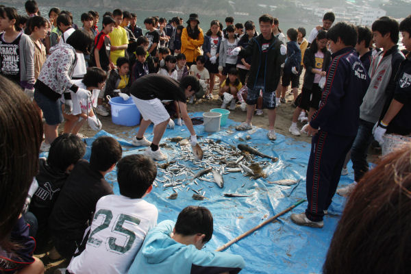 - 自然体験のため、昨日から岩地地区を訪れている生徒たちが、今日は地引網体験を行い、岩地の海を満喫しました。