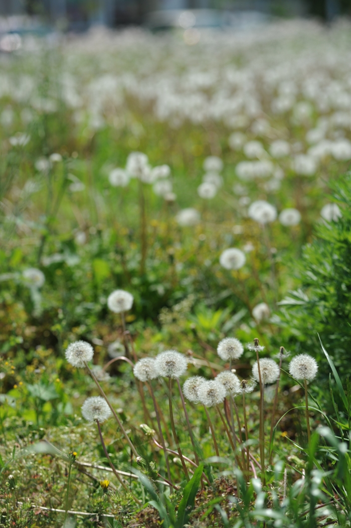 - タンポポの綿毛が一面に広がる空き地を町中に見つけました。 日の光を浴びて、綿毛が銀色に輝いています。