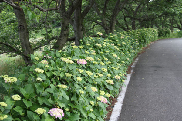 - 那賀バイパスでは、桜並木の下のアジサイが色づき始めています。見ごろを迎えるのが楽しみです。