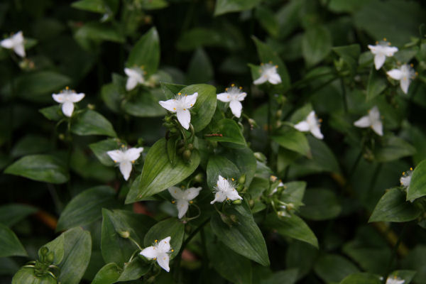 - 町内の道端などで、トキワツユクサが小さな白い花を咲かせていました。