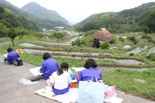 - 松崎中学校の生徒が、石部の棚田など町内各所でスケッチをしていました。生徒たちは目の前の風景とじっくりと向き合い、描いている様子でした。