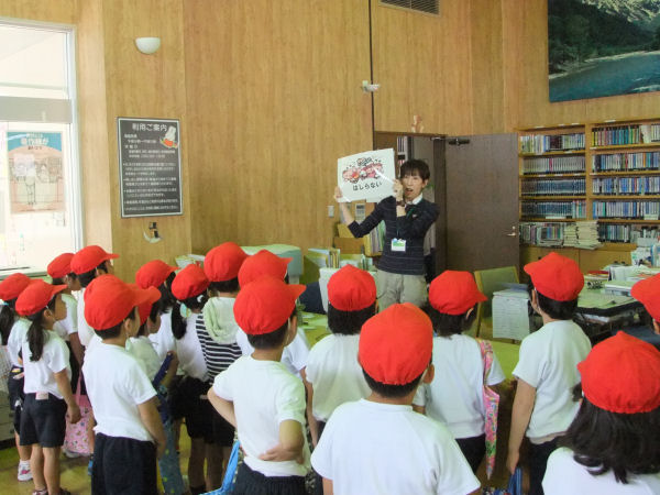 - 昨日の話題ですが、松崎小学校の1年生が図書館の使い方を教わり、実際にそれぞれが自分で選んだ本を借りました。